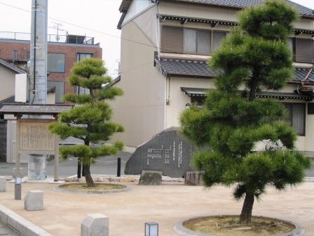 | しばらく進んで広い十字路を過ぎると、藤原為家・阿仏尼の歌碑が立っている。為家の歌と、為家の側室となりその没後出家した阿仏尼が、鎌倉への下向のおり詠んだ十六夜日記にある歌が刻まれている。 阿仏尼 「わがためや 浪もたかしの浜ならん 袖の湊の浪はやすまで」 |