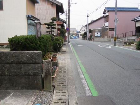 | 旧東海道は西北に進んでいるが、町並みの少なくなるところで、三叉路となる。 角に谷川道の道標があり、向かい側の石塀のまえには「高札建場跡」の石柱がある。 この辺りは、境宿とよばれる白須賀宿の加宿であった。 |