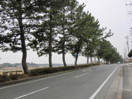 | 400mほど先で旧東海道は右へ曲り潮見坂を上って行く。潮見坂下の道標があり、「右旧道 左新道」と刻まれた石柱があ ここから坂を上って行き、どのあたりが遠州灘が一番良く見えたのかを確認するために、振返りながら進む。 潮見バイパスの道路が邪魔をしてよく見えない。 |