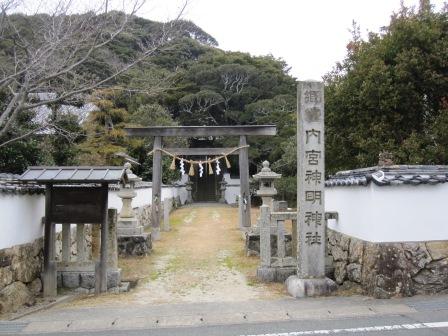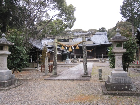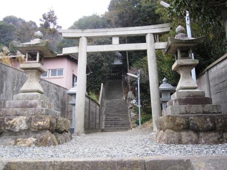 | しばらく先に広い十字路があり、北に進むと正面にある。 大岩村の氏神で、神社の由緒によると、文武天皇2年(698)岩屋山南山麓に創建祭司されたと伝えられている。のち正保元年(1644)大岩村の移転と共に現在地に移ったという。 |