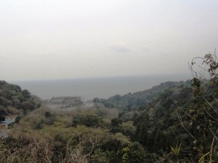 | 左へカーブして更に上っていくと、左から広い道が合流してくる。その先に潮見坂の説明板が立つ。 「西国から江戸への道程では、初めて太平洋や富士山を見ることができる場所として、旅人の詩情をくすぐった場所」とある。 予想していた景色とは違うが、昔の景色を思い描きながら振返って遠州灘を眺めた。 |