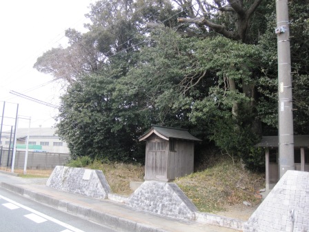 | 境川から200mほどで、国道1号線に合流する。 次の一里山交差点を過ぎるとすぐ、右側に小山と林があり、小さな祠がある。細谷一里塚で右側の塚のみ現存している。 説明板は 東西11m、南北14m、高さ3mといい、「一里山一里塚」と呼んでいる。 ここからは、真っ直ぐ西北に進む国道一号線を二川宿目指して約4kmの距離を歩くのみである。 |