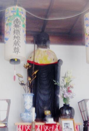 200m程先に青大慈寺の山門がある。静かな雰囲気の境内で、案内板によれば、宝暦6年(1756)この地で生まれた「きの女」が開いた如来教の本山という。その説法の速記録は「御経様]と呼ばれ、名古屋弁そのままで語られる特異な経典という。すぐ先に地蔵堂があり、等身大の鉄地蔵菩薩立像が安置されている。室町時代の作といわれる。 |