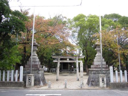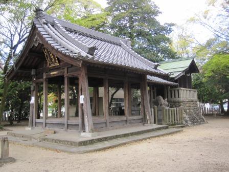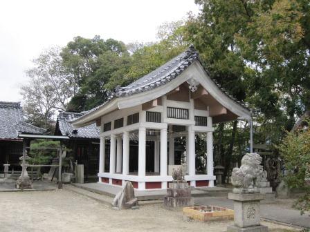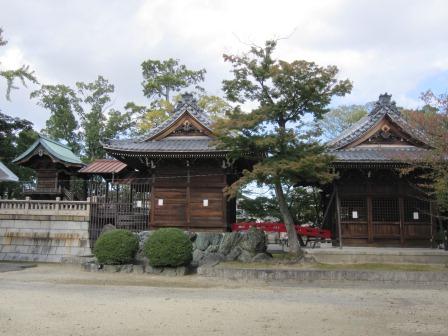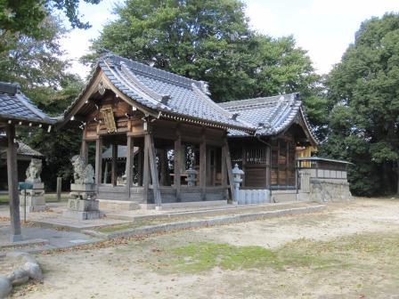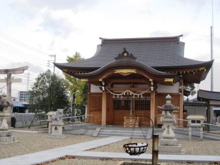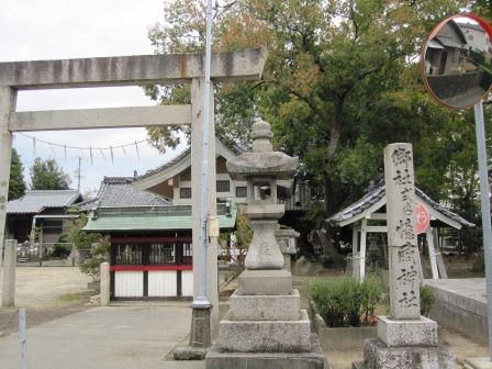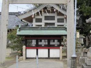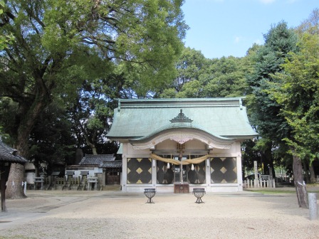天照皇大神宮と愛宕大権現の二柱を祀る愛宕神社で、コンクリート製の拝殿である。佐屋街道はここから南西に進み、新しくできた道路を超えてさらに名鉄線日比野駅方向に向かう。 本日の散策も終りに近く、最後に寄り道して100mほど東にある八幡社を訪れる。 |