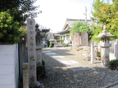 そこから街道は右に曲がる。神社の向かいは、光圓寺で大きな石燈籠の先に立派な山門がる。![]() この山門は、織田信長と斎藤道三が会見した場所と伝わる名古屋七間町の聖徳寺から移築したといわれる。 広い境内には真新しい三重塔がそびえている。 |