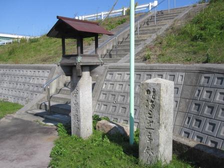 光明寺の東の細道を南に行くと遍慶寺(へんきょうじ)があり、門前に「岩塚城址」と刻まれた大きな石柱が立っている。 室町時代、尾張守の斯波氏の家臣であった吉田治郎左衛門重氏が築き、その子 守氏が居城したという。 光明寺前までもどる。 旧東海道は、西に進んで、庄内川を渡し船でわたる。 現在は、万場大橋をわたるが、その前に、北側にある七所社に立ち寄る。 土手まで行かずに少し前の道を右にはいり、高速道の下をくぐる。(要注意→土手沿いの道からは七所社へは行けない) |