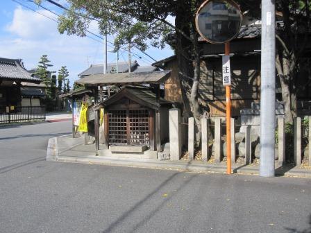 角には地蔵の祠があり、3体の地蔵が並んでいる。年代は不明であるが、彫の整ったもので、カラフルなよだれかけをしている。今まで見てきたお地蔵さんは赤いよだれかけが一般的だったが、これから先の佐屋街道沿いのお地蔵さんは、ほとんどがこのようなカラフルなものをまとっており、興味深い。 |