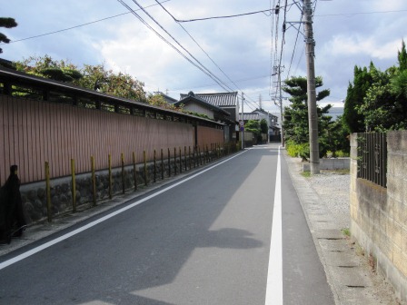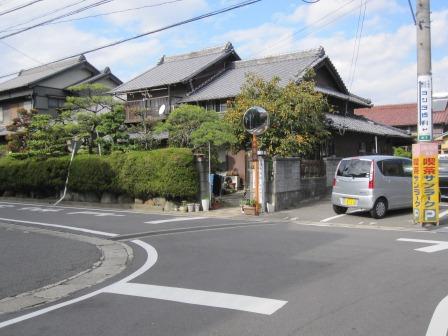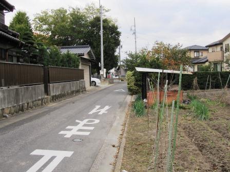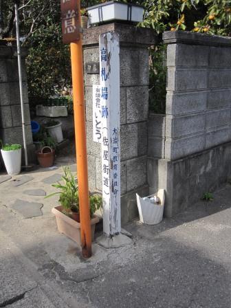 鳥居の先を右にカーブしたあと、旧街道らしい静かな道を200m程進むと、変形の四つ角がある。街道はそこから左に曲がる。その角の民家のブロック塀の角に「高札場跡(佐屋街道)」という細い標柱が立っている。 |