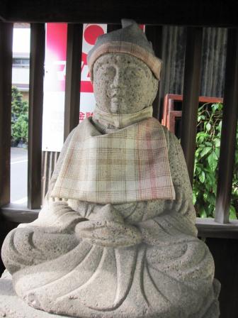 向かい側の角には、建物には似合わないほど立派な屋根を持つ地蔵堂がある。カラフルな頭巾とよだれかけである。 |