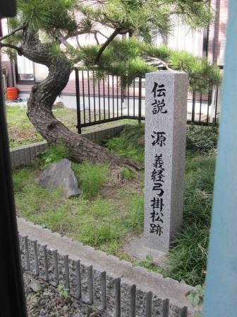 蟹江川を渡って50mほど、最初の細い道を左手(南)に入る。 細 道右側の民家の2~3軒先の金網フェンスの上に小さな案内板が掲げられている。(注意して見つけないと見落とす)「地元の言い伝えでは、義経が兄の命により京都に向かう途中、この地で軍勢を休ませ、側にあった松に弓をかけたことから弓掛けの松と呼ばれ地元で大切にされた。今の松は五代目である」という。 |