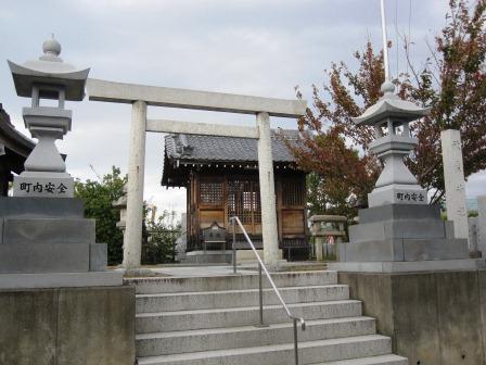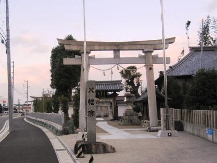 新しく整備された境内であり、囲いのない拝殿と小さな本殿が建つ。土手側には安永6年 (1777)の秋葉山常夜灯がたち、となりに明治31年と刻まれた橋柱がある。天保13年(1842)の常夜燈もある。 土手沿いの道を南に少し進み、そこからまっすぐ西に向かう広い道が佐屋街道万場宿の道である。 |