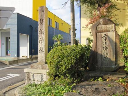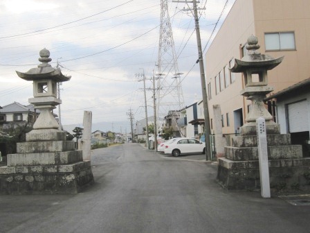 にぎやかな町並みとなる。500m程先の交差点角に「式内 諸鍬神社」の石標が建ち、横に獅子舞開祖 市川柳助碑がなあらんでいる一画がある。![]() しばらくすすんで、埋田町の交差点を過ぎ最初の道を左折し、すぐ先の細道を西に進む。(バス通りに並行する。) |