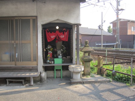 ![]() 歩道橋を降りて、国道から分かれ、ここからしばらくの間は、旧東海道の面影の残る静かな道を歩く。すぐ右側の普通の民家風の建物のアルミの格子窓の中に、馬頭観音などの石仏が安置されている。 |