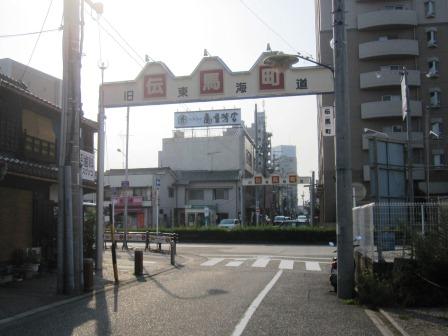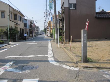 知立駅から北に200m程進み、旧東海道に出る。昨日の到着地点の交差点を左折して、、都築屋前から西に向かう。この右側には脇本陣があったという。200m程先のT字路を右に行くが、そこには目新しい石柱があり、「鳴海」の方向を示している。。 |