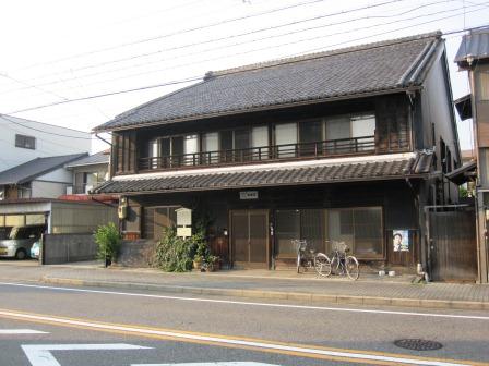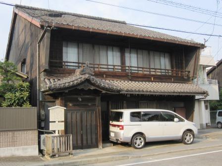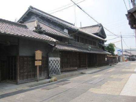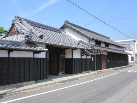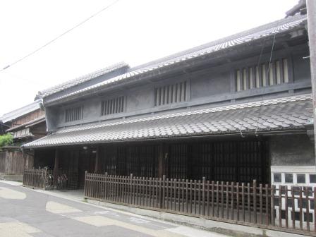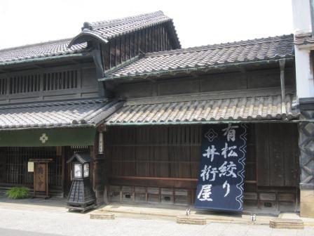 向かい側には、蔵と主屋が連なる「服部家住宅」がある。(屋号=井桁家)有松の絞問屋としての代表的な建物という。 蔵は、土蔵造りで腰に海鼠壁を用い、主屋は、塗篭造(ぬりごめづくり)で卯建(うだつ)がある。 商い中の看板が出ている。 |