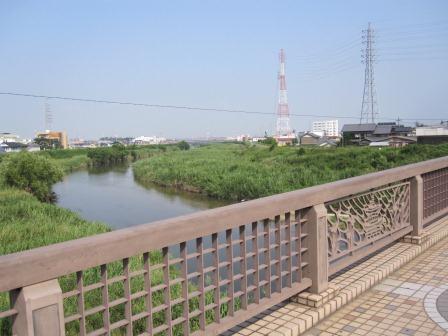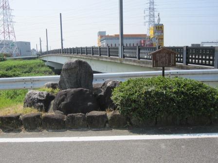 名鉄富士松駅を左に見てさらに進み、国道1号線を地下道でくぐる。 間もなく、境川に架かる境橋を渡る。三河国と尾張国の境で、慶長6年(1601)伝馬制度がもうけられてほどなく、橋が架けられ、中程より西は板橋、東は土橋で、長さは約24m、幅4.5mという。その継ぎ橋は何度か流され、明治になって欄干 付の土橋となったという(説明板)。橋を渡ると土手の道路脇に、自然石に刻まれた烏丸(からすま)と称された藤原光弘の歌碑(境橋の継ぎ目を詠んだ)と説明板がある。 |