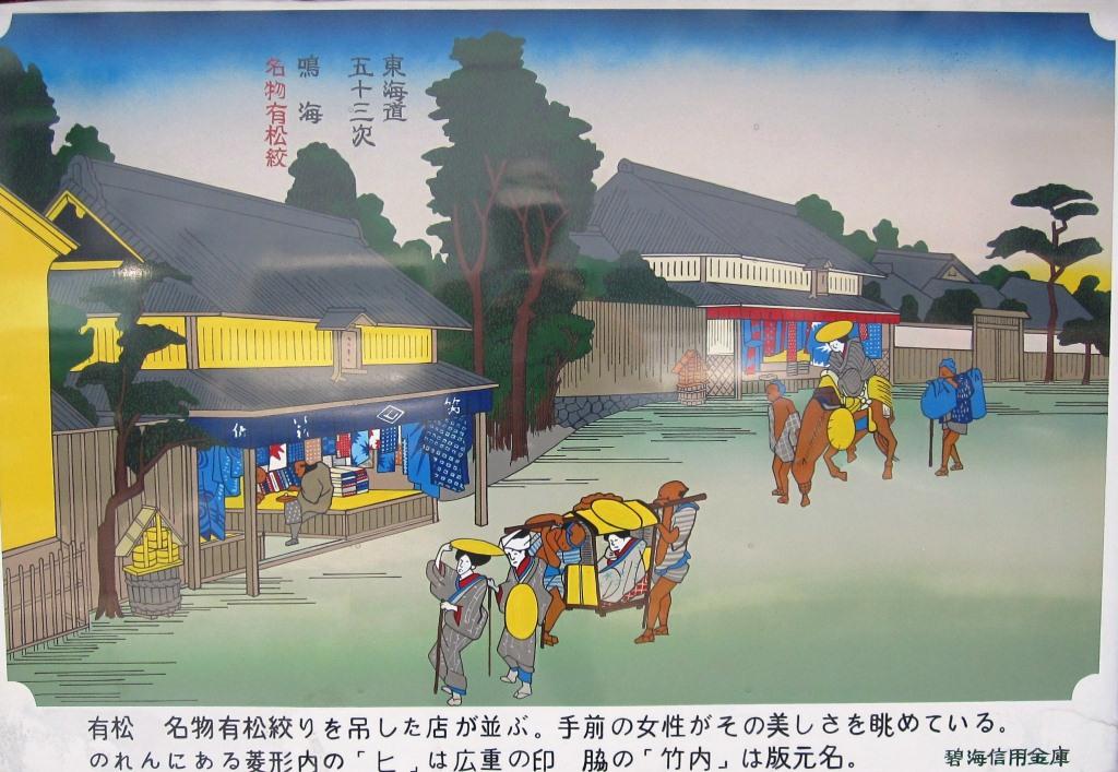 すぐ先左の駐車場の脇に、広重の絵「五十三次 鳴海-名物有松絞」が掲げられている。その奥には、有松絞の開祖・竹田庄九郎の石碑が立つ。 説明版によれば、「有松絞は尾張藩の 移住奨励策により、慶長13年(1608)知多郡阿久比庄より移住してきた竹田庄九郎が創始したといわれる。築城工事で名古屋に来ていた豊後国のものが着用の絞染衣類にヒントを得て、九々利染の業を考案したという。・・・寛永18年(1641)には二代藩主徳川光友に馬の手綱が献上された。その後二代庄九郎の時に三浦絞と呼ばれる新しい染めが開発され、藩の保護もあって急速に発展した。」という。 |