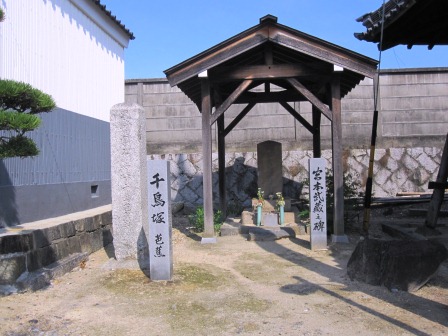 左=千鳥塚享保14年(1729)芭蕉の36回忌に建立された。「星崎の闇を見よとや啼き千鳥」芭蕉貞享年(1687)笠寺へ。 右=「新免宮本武蔵守玄信碑」とよばれ、武蔵の弟子の子孫らが百回忌を記念し延享元年(1744)に建立した。 |