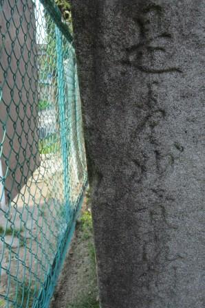 山崎川を渡った右手に小さな公園があり、隅に明治21年と刻まれた山崎橋の親柱があり、その手前に風化した道標が立っている。「 是・ 妙音院・・・」の文字が読める。 治承3年(1179)に平清盛の政変により太政大臣藤原師長(もろなが)は尾張へ流罪となった。その時の住居あとがここから200mほど東北にある妙音通りの嶋川稲荷にある。琵琶の名手で「妙音院」の号を持つ。 |