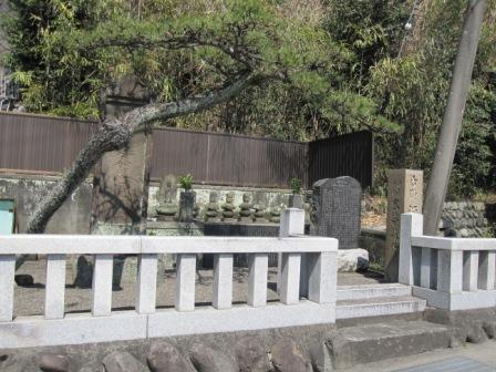 | すぐ先の、山に入る細い坂に立て札があり、坂を上った先に墓碑と説明板がある。 駿河を支配してきた今川氏が衰退し、北条氏はそれを助けるために駿河に駐屯し、永禄11年(1568)武田軍が薩捶峠に布陣し、北条氏康・氏政と対峙したが勝負はつかず、その後、北条早雲の3男の北条幻庵(長綱)の子、北条新三郎・長順兄弟を蒲原城に派遣した。しかし永禄12年(1569)武田信玄の長男勝頼を総大将とした3度目の攻撃により蒲原城は落城した。城主であった新三郎はこの付近にあった常楽寺まで逃れたが自害したという。 |