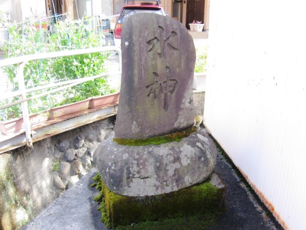 まもなく左手に「由比宿」の標柱が立つ。 その先の町内会倉庫の脇に「水神」と刻まれた石塔が立つ。さらに進むと右側に小さな堂があり、地蔵が2体祀られている。 |