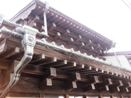 せがい造りとは、軒先を長く出した屋根を支えるために、平軒桁(ひらのきけた)へ腕木を付け足して出桁とし、垂木としたもの。 |