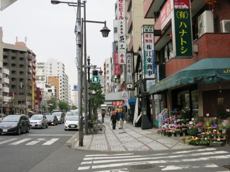 深川神明宮の前に「日本画家 伊藤深水誕生の地」という説明板が立つ。明治31年(1898)神明宮の門前で生まれたという。 200m程で森下駅前の交差点に到着。 ![]() |
