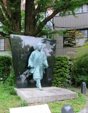 海辺橋の手前、西詰に、採茶庵跡の石柱と像が立っている。 芭蕉の門人 杉山杉風(さんぷう)が持っていた庵室で、海辺橋付近であったといわれる。 芭蕉庵からここに移り、少し過ごした後、この仙台堀川で船に乗り、隅田川を遡って奥の細道紀行に旅立ったという。 <滝沢馬琴 誕生の地> ![]() 海辺橋を渡った先の「老人福祉センター」の前に 「滝沢馬琴 誕生の地」の説明板がある。 「明和4年(1767)旗本松平信成の用人を勤める下級武士の五男として、この地にあった松平家の邸内で生まれた。 儒教思想に基づく教訓、因果応報による勧善懲悪を内容とした読本を続々と著わし、読本作家の第一人者と称された。」という。 手前に、南総里見八犬伝が置かれている。 |