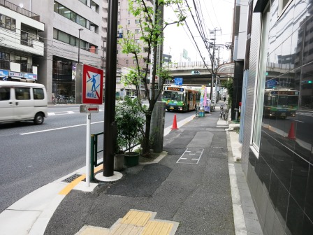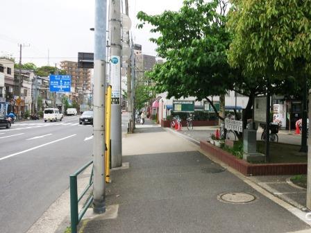 このあと、清澄通りを北に向かうが、寄り道して伊能忠敬住居跡に寄る。赤札堂の信号の前を西に向かい、最初の角を左折すると、「旧東京市深川食堂」の説明板がある。 その先で葛西橋通りにぶつかるが、その角に住居跡の石柱が立っている。 |