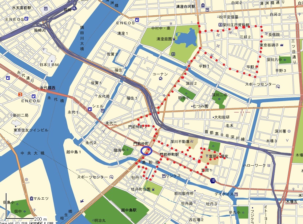 門前仲町の駅前は、清澄通りと永代通りが交差する広い交差点である。 江戸時代、このあたりは富岡八幡宮の別当寺 (神社を管理するために置かれた寺のこと) である永代寺の門前町として栄えたことから、深川永代寺門前仲町と呼ばれてい た。富岡八幡宮を訪れる前に、黒船稲荷神社にいく。 清澄通りを南に向かい、黒船橋を渡ったあと、左の路地をはいっていく。 黒船橋→ |