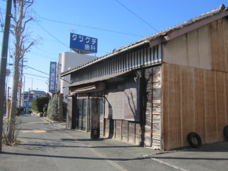 | 200mほど先の成子交差点の手前右側に夏目商店があり、「濱納豆」の古い看板がある。その先には木杭に「泣き子地蔵跡」の薄くなった文字が見える。 この交差点を右折して行くのが旧東海道である。そして100mほど先の交差点を左手=南西にすすむ。 |