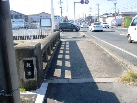 | しばらく行くと排水路に橋がかかり、鎧橋と名付けられている。左側に説明板が立ち由来が書かれている。 平安末期に戒壇設置のことで、比叡山の僧兵が鴨江寺を攻め、鴨江寺側の兵はこの辺一帯の水田に水を張り、鎧を着てこの橋の守りを固めて戦ったので鎧橋の名がついたという。双方の戦死者が千人がこの北側に葬られ千塚といわれたという。 (ここから約1km北に奈良時代に行基が建立したといわれる鴨江(かもえ)寺がある) |