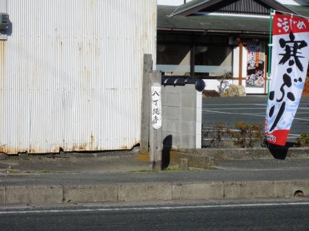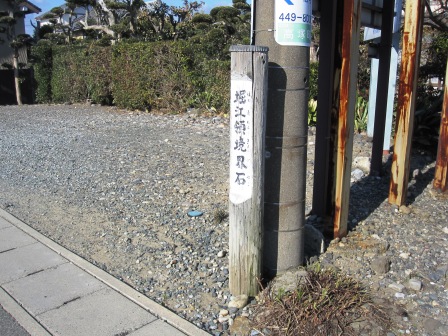 | 次ぎの交差点手前の駐車場の端に、石柱と説明板がある。「従是東 濱松領」と刻まれている。(植え込みの陰になっている) 宝永2年(1705)高塚村が旗本大沢家の堀江領となり、濱松藩側の増楽村との境界を示すために立てられたという。 この先の信号のある場所-日本生命の端の電柱の根元に、「堀江領境界石」と書かれた木杭がある。 |