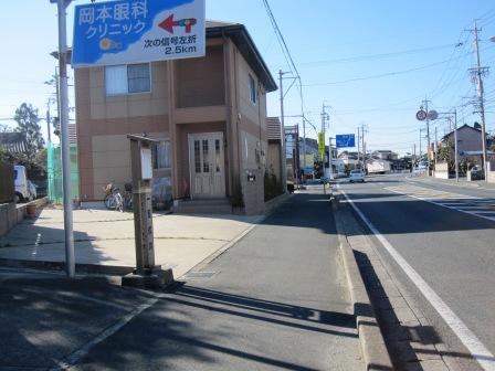 | このまま数百メートル進む。途中には熊野神社の参道が続く赤い大きな鳥居がある。更にすすんで、エンシュー高塚工場の広い敷地の前から、今まで歩いてきた国道256号は左へ大きく曲がる。 旧東海道はここか右に分岐する(真っ直ぐいく)。 三角の広場に篠原とある新しい道標があり、舞阪宿方向を示している。 |