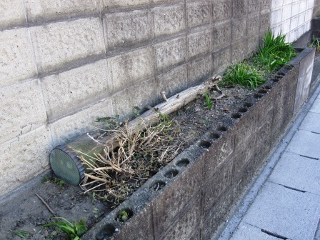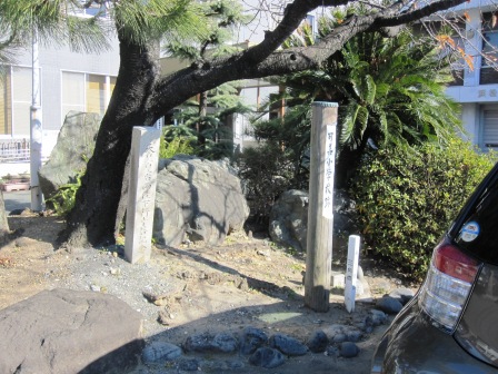 | しばらく進むと、左手に立場本陣跡がある。 道路側の草木のなくなった植え込みのあとに、朽ちた木杭がのこっている。 建物は安政年間(1854~59)に建て替えられたものという。 |