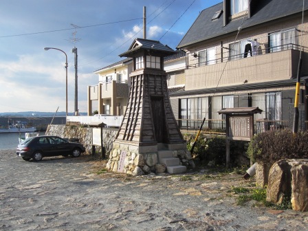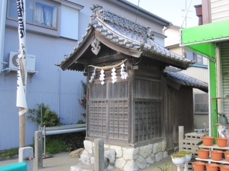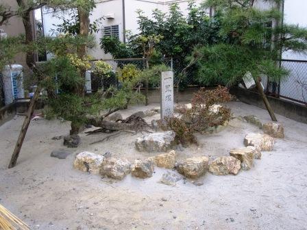 | 本雁木から南へ100mほど行くと小さな鳥居と祠がある。 その手前に「渡荷場跡」の説明板が立つ。 西側に渡荷場の石畳があったという。神社はここから30mほど東にあり、港の工事の関係でここに移されたという。 元の本雁木に戻り、北に行き北雁木に向かうがその前に指月院跡に向かう。 |