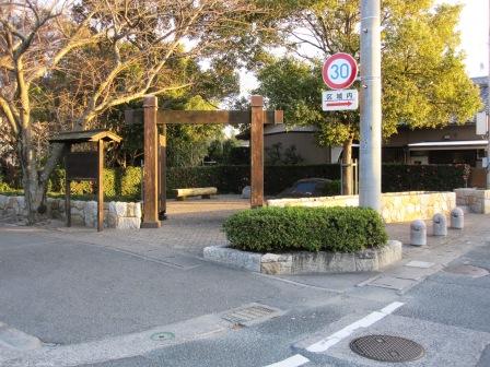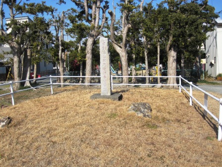 | 駅入口から南へ400mほどの新居高校の角を左折する。東へ300mほど行ったところ右側に小さな公園があり、説明板がある。 江戸初期に作られた新居関所(今切関所といった)と新居宿は元禄12年(1699)の災害で中屋敷に移転するまでこの地にあって、大元屋敷といった、という。東端に関所があり西に宿の町並みが続いたという。 |