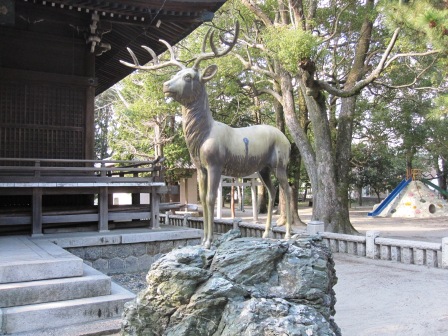 社殿の前には、狛犬ではなく銅製の狛鹿が立つ。 後方にある本殿は、きれいな赤に塗られている。 |