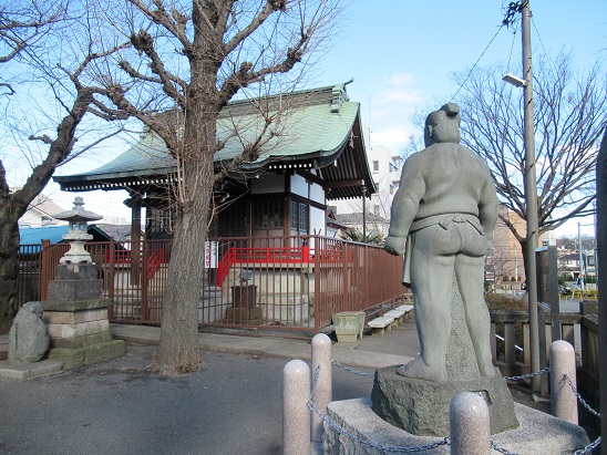 100mほど先右側に「竹の鼻公園」があり、その一角に竹の鼻一里塚の石碑が建つ。 公園の隣に永福稲荷神社がある。 神社は八王子市新町の鎮守で、宝暦6年(1756)、八王子出身の力士八光山権五郎が再建し相撲を奉納したという。社殿の前には、八光山権五郎の大きな石像が立っている。 |