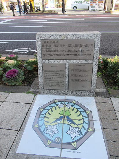 街道に戻り、西に進むと、国道16号線との交差点・・八日町交差点・・となる。![]() 八王子道路元標がある。・・・2016年に横浜から「絹の道」をあるき、ここがその時の八王子の終着点である。 100m程先の八王子夢美術館の前には八王子宿跡と刻まれた大きな石碑が立っている。 |