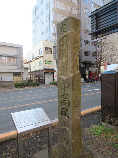 しばらく進むと、追分町となり、甲州街道は、陣馬街道と分岐する。 陣場街道は案下川、案下峠を経由して相模国の津久井郡佐野川に至る古道であった。 追分町交差点に架かる長い歩道橋を、高尾方面に向かって下りた少し先に、復元された大きな道標が建っている。説明板によれば「文化8年(1811)江戸の清八という足袋職人が、高尾山に銅製五重塔を奉納した記念に、江戸から高尾山までの間に建てた3つの道標の一つという。」 「右あんげ道 左 甲州街道高尾山道」 と刻まれている。 |
