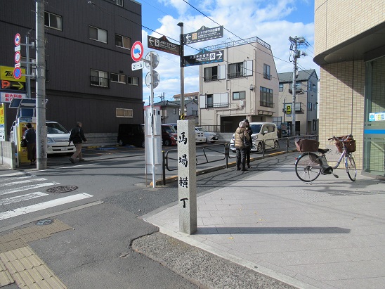 追分から、街道は南西に向かって真っすぐに伸びていく。 両側のイチョウ並木がすばらしい。 千人町の地名が続く。 西八王液近くの交差点に「馬場横丁」の石 柱が建っている。 この辺りに、千人同心の馬場訓練場があった場所という。 |
