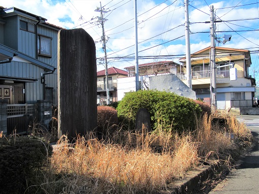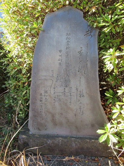 その先 長房団地入口交差点を右折し、すぐ先を左折すると、そこは甲州街道の枡形となっている場所である。 、「右 高尾山 左 真覺寺」と刻まれた高い道標が建ち、その脇には、芭蕉の句と共に、昭和2年の新道建設時の枡形の絵図が、彫りこまれている石碑が建つ。 また この辺りに「散田一里塚」(日本橋より13番目)があったといわれ、または、この少し先の市役所横山事務所前にある大きな木のある場所が一里塚跡という説もある。 ![]() |