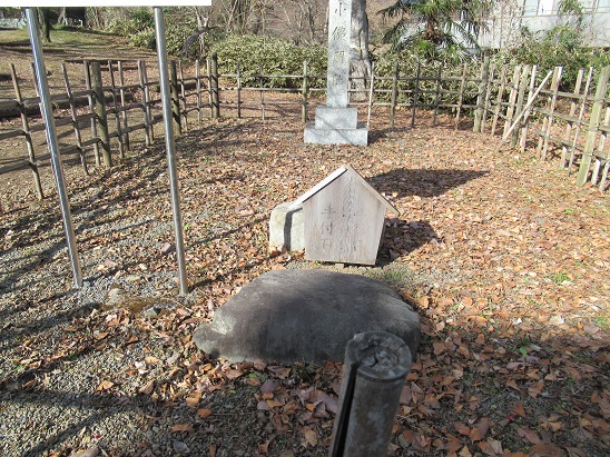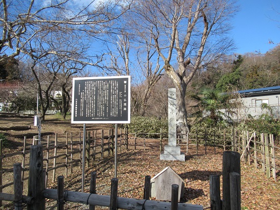 広い公園の手前に、柵に囲まれた 「史跡小佛関跡 」という大きな石柱が建ち、、その手前に、平らな石が置かれている。 小仏関所は、戦国時代には小仏峠に設けられ富士見関とも呼ばれていたという。 ![]() 旅人は手形石(奥)に手形を置き、手付石(手前)に手をついて通行の許しを待ったそうだ。 |