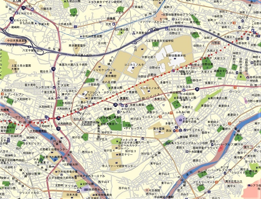 西口から中央線に沿って急坂をのぼり、坂下地蔵で途絶えた道を左に見て、大阪上通りを進む。 中央高速の高架下を通過した先が、日野台地で、国道20号線に合流する。 右側には、日野自動車の広大な敷地が続く。 |
