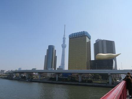 雷門通りから、馴染みのある景色を左手に見ながら吾妻橋を渡る。 隅田公園の桜はすでに咲き始め、多くの人であふれている。 ただし吾妻橋を渡って東に行く人は少ない。 ここには、安永3年(1774)の架橋された木造の「大川橋」とよばれていたが、その後 明治9年(1876)に架け替えられて吾妻橋となった。 200mほど先の、五叉路を南に進み、二つ目の信号を左折すると、本所中学校がある。 |
