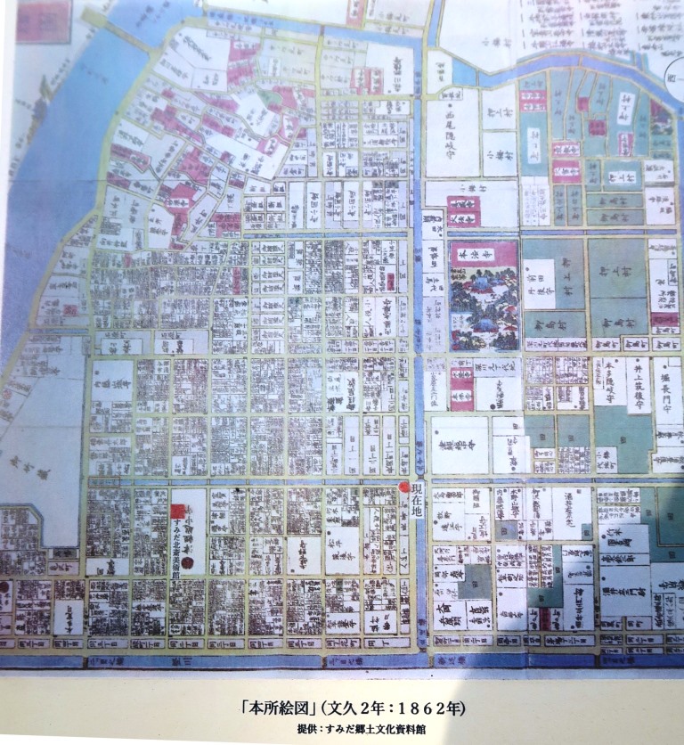 大横川親水公園の中を200mほど北に進み、、「北斎通り」を西に向かって散策する.![]() すぐ先の歩道に、北斎通りの由来=『本所割下水(わりげすい)』 が記された説明板が設置されている。 それによると、「割下水とは、かってここを流れていた下水の呼称で、1650年代末以降の本所開拓の中で開鑿(さく)された下水で、かってはその両側に道があった、という。」 「昭和初期に暗渠になり、平成に入ってから道路整備され、『北斎通り』という名前となった。」 北斎もここの住人であり、北斎通りは、ここから約1km西に続く。 文久2年(1862)の本地絵図が記されている.(写真をクリックすると拡大) |