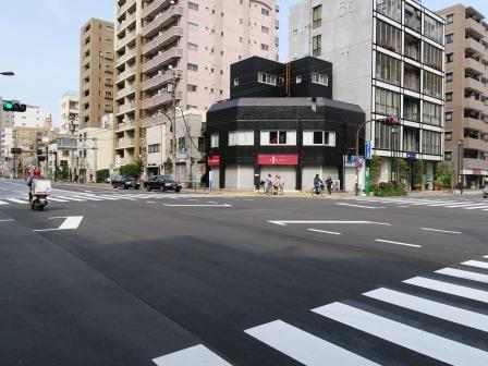 しばらく北斎通りを進むと、三ツ目通りと交差する亀沢4丁目交差点の北東角に、三階建ての黒いビルがたっている。 ここが、足洗い屋敷のあった位置であるという。 |