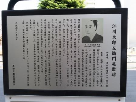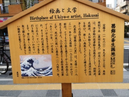 緑町公園の西側の道路のの中ほどに、大きな説明板が立っている。天保6年(1835)、35歳で韮山の代官に就任し、伊豆・駿河・武蔵・甲斐の五か国の天領を管理していた。伊豆・駿河以外の支配については江戸屋敷で、手付3人、手代14人を使っていた、という。 この地で、55歳で亡くなった。、 ここから、隅田川の西岸にあった松浦家の上屋敷跡を訪れる前に、少し寄道をして、両国駅の南側・・・北斎の住居跡と、勝海舟の生誕地を訪れる。 |
