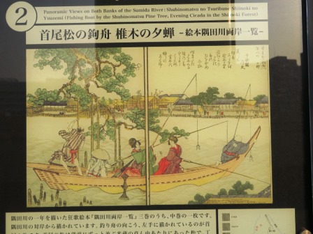 安田庭園の西側の自動車道路に突当り、隅田川側の歩道を南に進む。 そこに、このあたりの場所を隅田川の対岸から描いた、「首尾松の鉤舟」の絵と説明がかかげられている。 隅田川の一年を描いた『隅田川両岸一覧』のうちの一枚で、舟の先に大きく描かれている松が、西岸の蔵前の米蔵の真ん中あたりにあった松で、「首尾の松」と呼ばれ、そのあたりは釣りの名所であった。 釣糸のさきにある右側の森(蔵前からみると対岸)が、肥前平戸新田藩 松浦家の上屋敷という。 これが、「落ち葉なき椎の木」 の屋敷である。 (次の行の写真をクリック) |